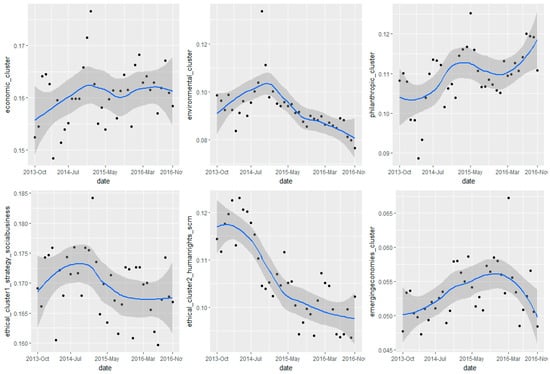 The topics of three clusters (economic, philanthropic, emerging economies) appear to be increasing in trend. The topics of the philanthropic cluster are community-oriented as shown by the top words of those topics, such as help needed, ngo, crowd funding, give back, gifts, community, charity, donation, and local. There is a strong positive trend of this community focus cluster. The other three clusters are either steady (ethical cluster #1) or declining (environmental cluster, ethical cluster #2). Since Topic 25 (Business ethics) forms two network clichés with other topics, two clusters were considered. Ethical cluster #1 is a discussion of ethics in strategy and social business contexts. This cluster appears to be steadily high. On the other hand, ethical cluster #2 (ethics + human rights + supply chain) have declined in popularity. Likewise, environmental cluster displays a slightly declining trend.