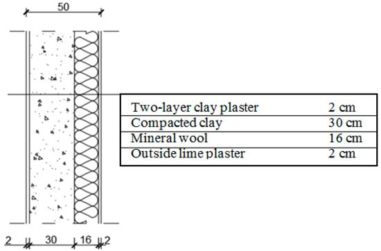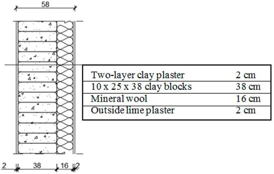 The first studied structure a wall variant was made of 10 × 25 × 38 cm clay blocks insulated with mineral wool boards. The structural layer of the wall is 38-cm thick (Figure 1). On the outside, the wall is insulated with 16 cm-thick mineral wool boards and covered with lime plaster. On the inside, the wall is covered with a two-layer clay plaster.