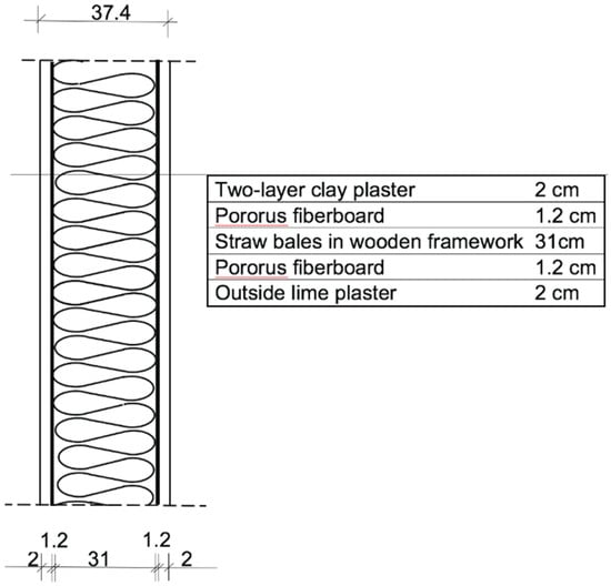 The third variant is the wall made of small 31 × 41 × 70 cm straw bales placed in a wooden frame structure (Figure 3). The frame structure will be erected in the timber-frame house technology where the posts are made as frames—so-called ladders. The wooden frame skeleton will be clad on both sides with 12-mm fiberboard for good adhesion and improved thermal insulation. The wall will have a lime plaster on the outside and a two-layer clay plaster on the inside.