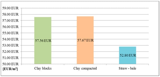 The wall made using the ‘straw-bale’ technology proved to be the cheapest solution (Figure 4); as such, the division wall made of clay blocks and clay compacted in framework turned out to be a less economic solution. The poor result obtained for a clay division wall has been primarily due to factors including the considerable amount of labor and the more expensive thermal insulation type. In the case of clay compacted in framework, shuttering makes for an additional cost.