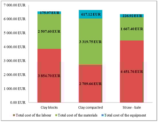 Among the analyzed exterior wall types, the walls made of compacted clay shows the lowest labor cost. In case of a clay block division walls, the higher labor cost is primarily generated by the prolonged process of clay preparation and block formation. The walls made of straw bales in a wooden framework turned out to be the most expensive solution as regards the labor cost. More precisely, the whole framework construction determines this high labor cost.