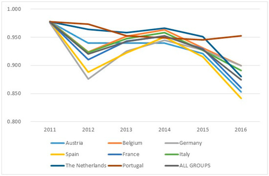 Table 4 shows the evolution of the efficiency scores for the whole set of banking groups and the change in the mean value of efficiency from 2011 to 2016. Table A1 and Table A2 split the same information with respect to country and group size.