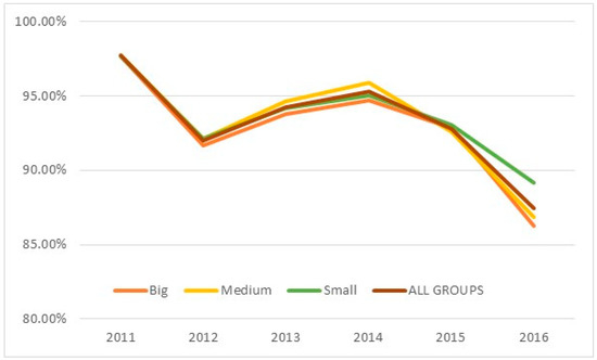 Figure 1 illustrates the trend of the average efficiency score of the observed banking groups in the period 2011–2016 with respect to the country, while Figure 2 shows the same information with respect to the size of each group.
