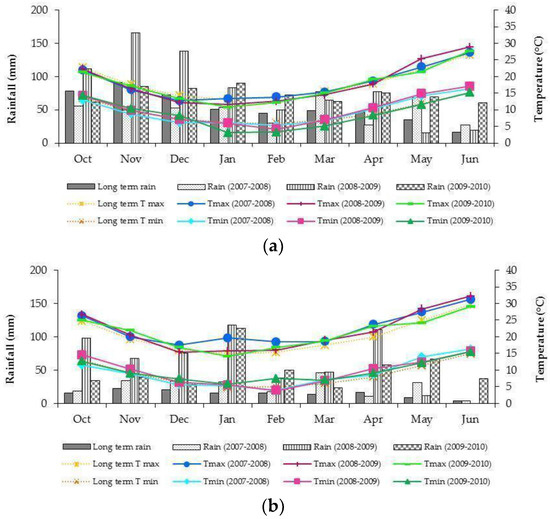 At Exp. 1 site, total rainfall in 2008–2009 and 2009–2010 was 51% and 38% higher than the historical averages (49-year mean value), respectively, whereas in 2007–2008, total rainfall was very close to the long-term annual mean (445 vs. 479 mm year−1; Figure 1a). At Exp. 2 site, significant variations in cumulated rainfall were recorded throughout the study period and in comparison to the long term series (37-year mean value). Figure 1b shows that rainfall was higher in 2008–2009 and 2009–2010 than 2007–2008. In general, the 2008–2009 and 2009–2010 cropping seasons were wetter compared to the historical trend, whereas 2007–2008 was exceptionally dry at the beginning of the oilseed rape growing cycle (November–January). Each year, during the March–June experimental period, monthly mean maximum and minimum air temperatures were ˂1 °C higher than the long-term means values (Figure 1a,b).