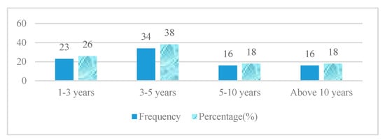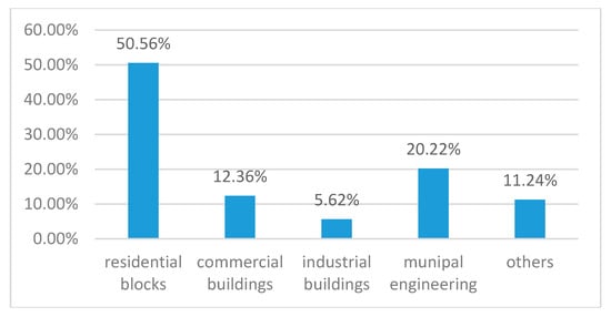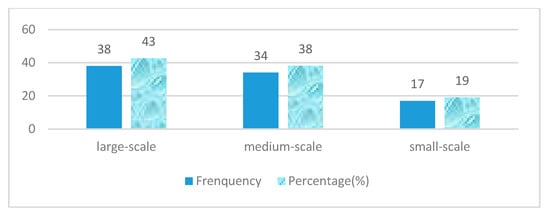 The questionnaire survey was conducted in July 2017 and 100 responses (11 invalid) were received by the end of August 2017. The respondents, from 17 cities in Mainland China, are selected from the research team and their colleagues who work on site. Moreover, all of the respondents must hold a management position on their construction sites, e.g., project manager, chief supervision engineer, group leader, technician, etc. 36% of the respondents have more than five years’ experience on construction sites. The types of building they operated include residential blocks, commercial buildings, industrial architecture, and municipal engineering. In sight of the respondents’ experience and the scope of investigation, their opinions were representative for the research to ensure the reliability of the findings. The experience of all respondents, the scale and type of the project under their management are shown in Figure 1, Figure 2 and Figure 3, respectively.