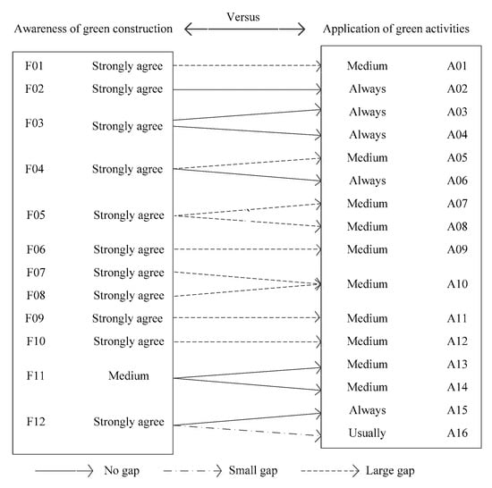 Based on this, a comparative diagram with three types of relationships named no gap, small gap, and large gap between awareness and implementation are identified, as shown in Figure 4. No gap means the percentage of awareness agreeing the importance of green construction and the frequency of carrying out green construction activities are at the same level. A one-level difference denotes a small gap and a two or more level difference represents a large gap.