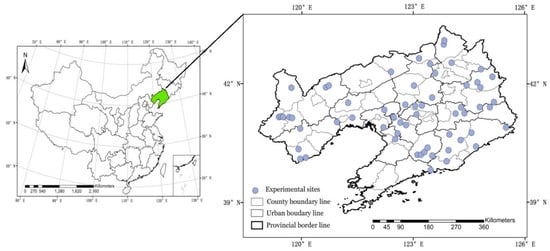 Location map of the 60 experimental sites for maize in Liaoning province of Northeast China.