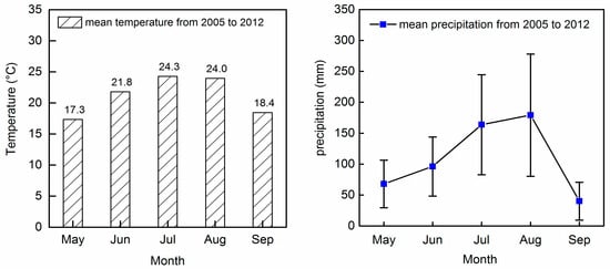 The data for the study were collected from field experiments conducted at 60 experimental sites in the main maize-producing regions in Northeast China (Liaoning Province, 38°43′ N–43°26′ N and 118°53′ E–125°46′ E) between 2005 and 2012 (Figure 1). Local maize cultivated varieties, i.e., Zhengdan985, Liaodan565, and Danyu402, were planted in early May and harvested in late September. The typical subtropical–humid monsoon climate is characterized by hot summers with intensive rainfall, abundant sunshine, and long and cold winters. The majority of rainfall was concentrated in the maize-growing seasons, where, across all sites, the average monthly precipitation was 109 mm. The mean monthly temperature was 21.8 °C during the maize-growing seasons in 2005–2012 (Figure 2).