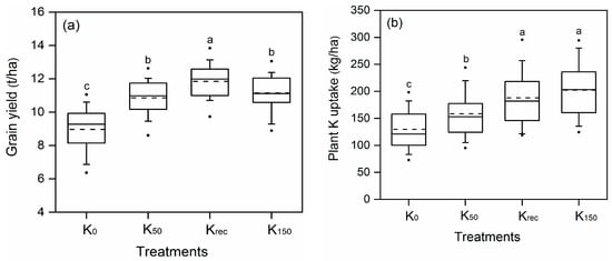 Grain yield (a) and plant K uptake (b) for maize under four different K application treatments across 60 experiment sites. Black solid and dotted lines represent the median and average values, respectively; the upper and lower of Box edges represent the 25th and 75th quartiles; whisker caps indicate the 90th and 10th percentiles; and circles denote the 95th and 5th percentiles. Lower-case letters indicate a significant difference (p < 0.01) among the four treatments.