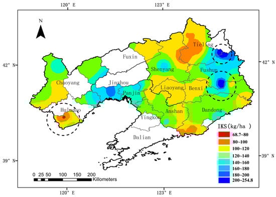 The spatial distribution of the indigenous K supply (IKS, kg/ha) in parts of regions of Liaoning province of China.