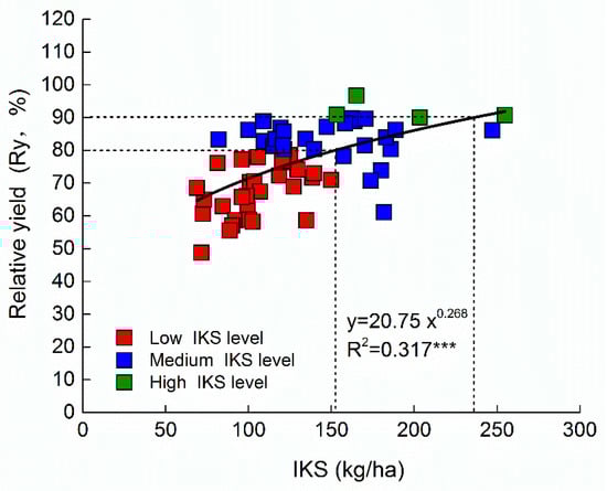 To better estimate optimum K rates at different levels of IKS, the levels of IKS values were classified into three different levels. Zhang et al. [36] used the relative yield of <85%, 85–95%, and >95% soil nutrient supply for the three levels. Different from previous studies, we considered the uniformity of the classification standard of IKS, and thus established a power function relationship between relative yield (Ry) and IKS (Figure 5). Here, we used the relative yield values of <80%, 80–90%, and >90% as the grade values to divide IKS values into three different levels (low, medium, and high soil K supply) (Figure 5). This classification method has also been used for other nutrients and crops [21,37].