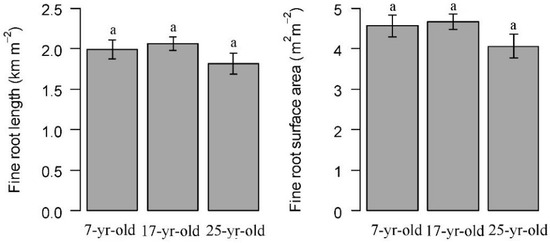 Total live fine root length and surface area in Chinese fir plantations at different ages. Error bars indicate standard error. Different letters indicate significant differences among different stand ages (P < 0.05).