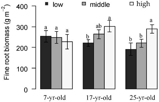 Fine root biomass at different slope positions in Chinese fir plantations at different stand ages. Error bars indicate standard error. Different letters indicate significant differences among different slope locations at the same aged plantations (P < 0.05).