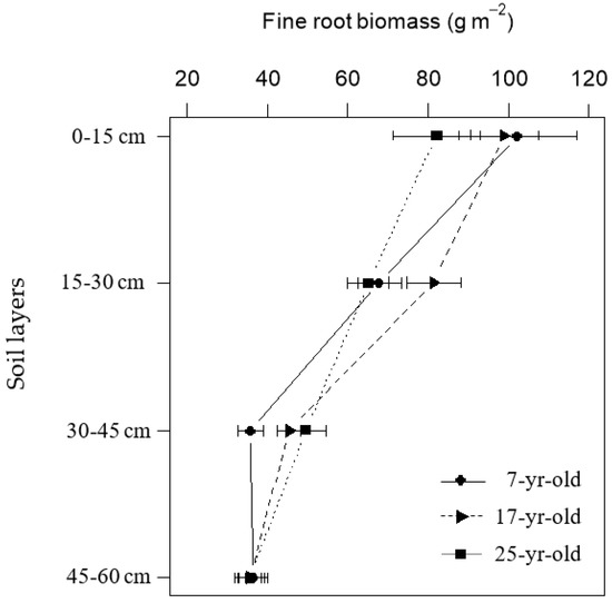 Vertical distribution of fine root biomass with increasing soil depth in Chinese fir plantations at different stand ages.