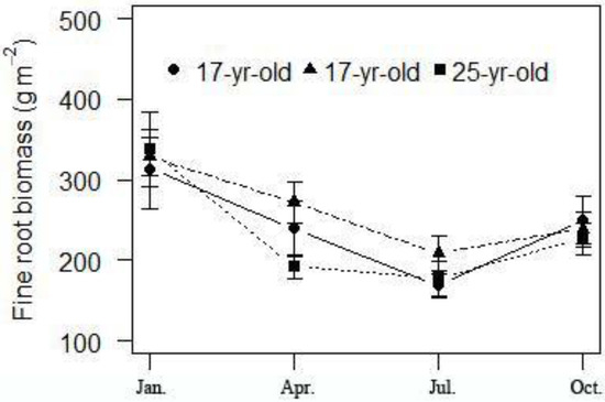 Fine root biomass would fluctuate within a certain year, which may be due to changes in soil temperature and moisture [39]. The studies on seasonal variations in root biomass had reported that stand ages were consistent with the seasonal variation pattern [40]. Fu et al. [34] believed that low temperature is the influencing factor of fine root dynamics. Some scholars believed that the rising soil temperature and rainfall will lead to a fine root vigorous growth period in the early spring season with sufficient carbohydrates stored in the previous season to store [41]. Yang and Li [42] had given an overview describing fine root distribution research and pointed out that the peak of the community fine root growth occurred in July and October in the broad-leaved and conifer mixed forest. Makkonen and Helmisaari [41] inferred that fine root biomass arose in about March or April. It is surprising that our results showed different patterns, that fine root biomass was highest in January and lowest in July in all the Chinese fir plantations. Although similar results also had been reported that the minimum value of fine root biomass generally appeared from May to July [40,43]. The fine root biomass dynamics were not only related to the fine root growth, but also the longevity and turnover rate, which merits further investigation.