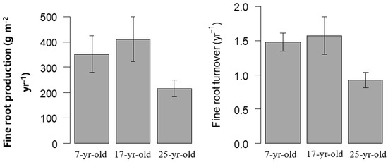 Fine root production and turnover varied dramatically with stand age. Fine root production and turnover were consistent with the trend of age, and the value increased first and then decreased with Chinese fir stand development. The fine root production was 352.54, 410.85 and 217.61 g m−2 year−1, and turnover rate was 1.48, 1.57 and 0.92 year−1 in 7-year-old, 17-year-old and 25-year-old plantations, respectively (Figure 7).