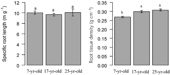 Comparison of specific root length and root tissue density in Chinese fir plantations at different ages. Error bars indicate standard error. Different letters indicate significant differences among different stand ages (P < 0.05).