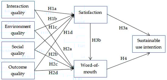 Customer satisfaction plays a significant role in service marketing, as it is a prominent predictor of subsequent behavior of customers. Satisfaction refers to the comparison between perceived performance and expectations (e.g., expectancy disconfirmation theory). In the study of SNS mobile service quality, customer satisfaction was identified to exert a positive influence on the continuous usage intention of WeChat mobile service users [7]. Higher customer satisfaction (both transaction-specific and cumulative satisfaction) formulates and preserves more sustainable and long-term relationships between customers and service providers [5]. Satisfied customers tend to maintain their intention of use and are likely to have positive WOM communication as well [17,18]. Satisfied customers are more likely to be motivated to share their experiences using WOM with other Web 2.0 users [42,43]. These results suggest that customer satisfaction has a positive relationship with both sustainable use intention and WOM. Thus, this study proposes the following hypotheses:
