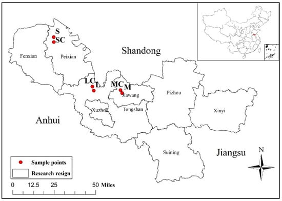 The studied coal mining area (34°13′39″–34°26′16″ N, 117°06′21″–117°12′16″ E) is located in the Jiuli District, Xuzhou, Jiangsu Province, eastern China (Figure 1). The study area has a warm temperate zone with a semi-humid monsoon climate and four distinctive seasons. The area has an average annual temperature of 14 °C, an annual sunshine duration ranging from 2284 to 2495 h, an average annual frost-free period of 200 to 220 days, an average annual precipitation of 800 to 930 mm, and an average annual humidity of 72%. The region is characterized by abundant climatic resources, is suitable for growing crops, and is an important grain-producing area of northern China. The underground water level of normal paddy-upland rotation land in the area is 0.80 ± 0.20 m, while that of normal upland is below 1.0 m.