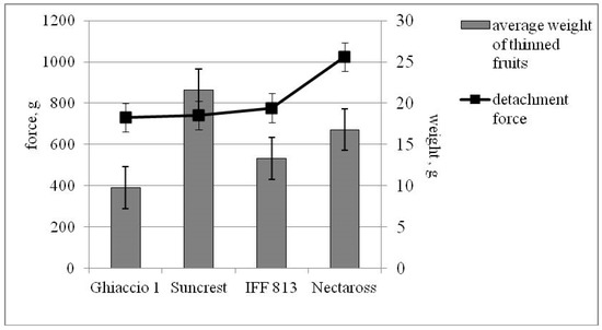 Detachment force and average fruit weight of the four varieties at thinning time (with bars of standard error).