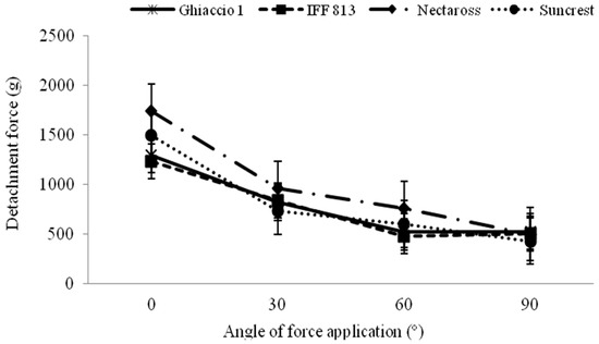Cultivar comparison of detachment forces at different detachment angles (with bars of standard error).