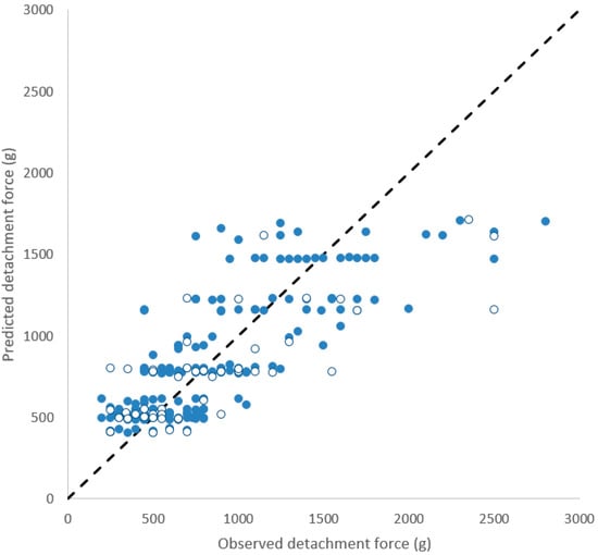 Scatter plot of the observed versus predicted (using the generalized regression neural network (GRNN) model) force needed for fruit detachment (g).