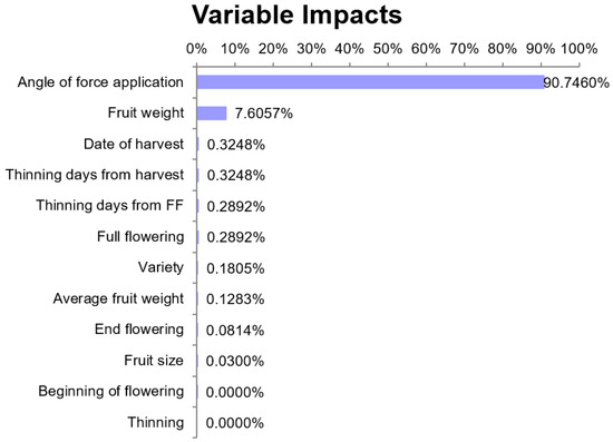 Regarding the weight of the variables included in the GRNN model (Figure 6), the impact of the angle of force application and fruit weight were important variables for more than 98% of the total analysis, while the others did not show any significance. This neat result confirms the cultivar comparison’s (Figure 4) conclusion that the angle of force application is the most important variable for fruit detachment. Therefore, it must be taken into consideration for prototyping thinning machinery.