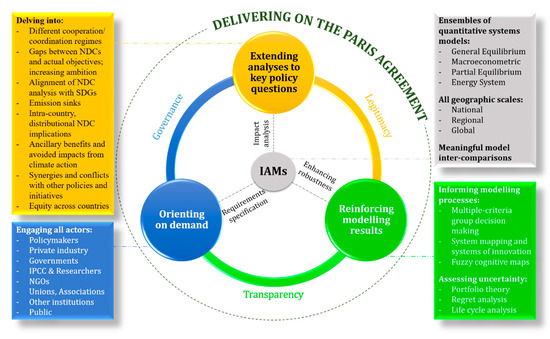 In this positioning paper, we argue that scientific activities in support of climate policy design, in light of the Paris Agreement and the emerging challenges, must satisfy three essential conditions. First, they must build on ensembles of different and complementary—in terms of geographic and sectoral coverage and detail, theoretical underpinnings and mathematical structure—IAMs and other modelling tools with the capacity to extend the analysis beyond the usual research questions. The integration of different modelling approaches allows carrying out true multi- and inter-disciplinary assessments. Secondly, they must place all relevant actors at the core of modelling activities, from the formulation of policy questions and the definition of modelling assumptions in a demand-driven approach, to the mobilisation of their knowledge in bridging knowledge gaps. Thirdly, they must include well-established methodologies that, when meaningfully soft- or hard-linked with IAMs, can effectively address the aforementioned challenges and result in robust and reliable policy prescriptions.