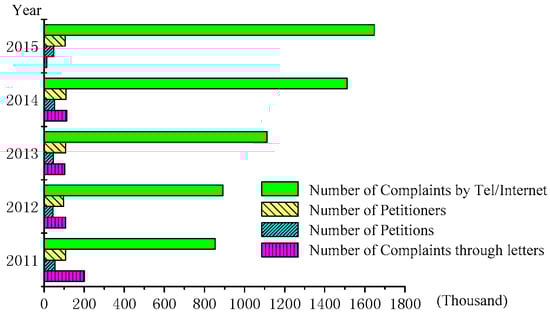 Figure 1 shows the number of public complaints provided by the environmental protection administration at all levels through the channels of letters, telephones, and the internet from 2011 to 2015. The total number of complaints has been increasing annually and a major proportion of the complaints were conducted through the telephone and Internet. Figure 1 indicates that the frequency of public participation in environmental governance is growing, and the channels for complaints have been transferring from traditional letters and petitions to the telephone and networks. The origin of the data comes from the Annual Statistic Report on Environment in China and China Statistical Yearbook on Environment from 2011 to 2015 [,].