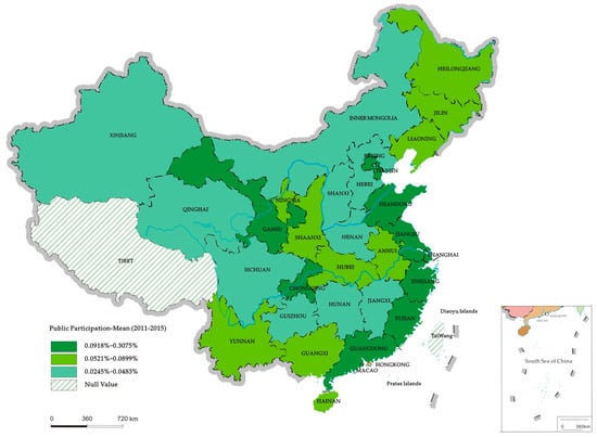 Over the past thirty years, public participation has been in a dominant position of determining how society manages or protects the environment in many countries []. The general public ought to have the right to live in a healthy environment, and more often than not, they have a better understanding of their surroundings. They could offer crucial information and suggestions for environmental governance []. Public participation could reduce the costs of monitoring violation and take responsibility for prosecuting violators []. Citizen involvement is intended to produce better decisions, and thus generate more efficiency benefits for the rest of society []. Public participation has not only improved environmental policies, but also played an important educational role and helped resolve the conflict and mistrust that often plague environmental issues [].