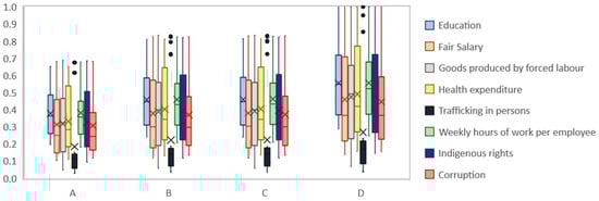Among the 42 assessed indicators, the result from the data quality assessment showed the reliable social indicators of the six investigated datasets as the followings: Public spending on education (Education), Fair salary, Goods produced by the forced labor, Health expenditure, Trafficking in persons (Trafficking), Weekly hours of work per employee (Worker hours), Respect of indigenous rights (Indigenous rights), and Public sector corruption (Corruption). In Table 4, the relevant stakeholder according to the categorization made in PSILCA, inspired by SLCA Guidelines [24], for each indicator is given. This study covered four out of five stakeholders listed in the SLCA Guidelines.