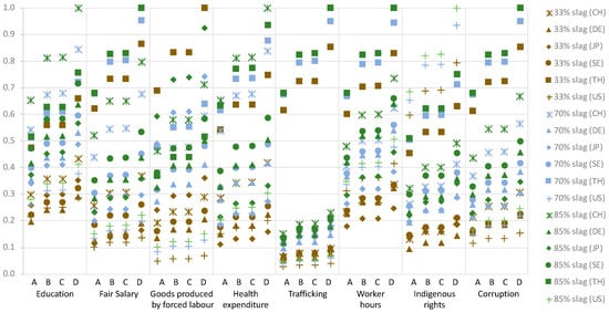 As an overall characteristic regarding the geographic representation, Thai and Swiss products performed worse for most of the considered indicators. Furthermore, the influence of region was clearly seen on fair salary, trafficking, worker hours, indigenous rights and corruption, where the Thai datasets were the worst performing. Regarding the best performer, the products from the US was the best in fair salary, goods produced by forced labour, and trafficking. Concerning the influence of product design, the social performance was worse with the higher steel slag content regardless of the regions, all but the goods produced by the forced labour of the Thai dataset.