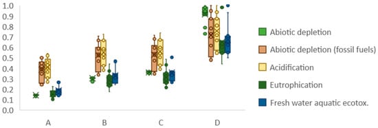 For examining the influence of the company classes on the environmental performance of the green concrete, Figure 3 and Figure 4 shows the distribution of the result of the normalized impact by the classes.