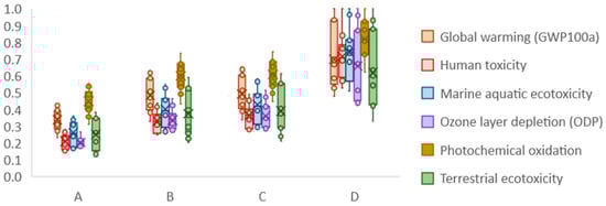 In Figure 5, the results of the LCIA of each dataset that investigated the relevance of the product design and the region are shown.