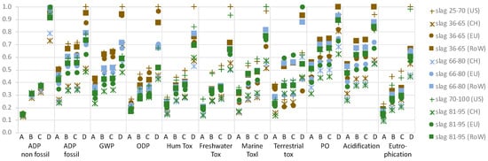When analyzing the hotspots in the three groups of inventories as described in Section 2.3, the relevant groups differed depending on the ratio of the slag and the geographic representation. For the Swiss green concrete, clinker related inventories were the hotspots regardless of the slag mixture ratio for freshwater toxicity, marine water toxicity, and eutrophication. Thus, complete replacement of the clinker could be an ideal strategy to reduce the water-related impact categories in case of Switzerland. For GWP, abiotic depletion of fossil fuels, human toxicity, and acidification, grounded slag was the hotspots when the mixture ratio of the slag was over 80%.