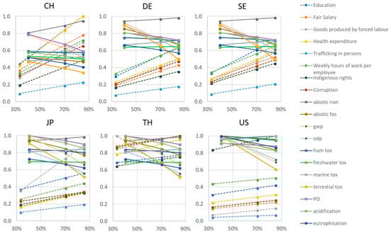 From the impact assessments, the tendency of the trade-off between the social and environmental performance from the change of the product design was observed. In Figure 6, the illustration of the social and environmental performance of the green concrete with different steel slag content in the six investigated countries are shown. In the figure, solid lines represent the environmental impacts and the dotted lines represent the social impacts of the steel slag mixed concrete.