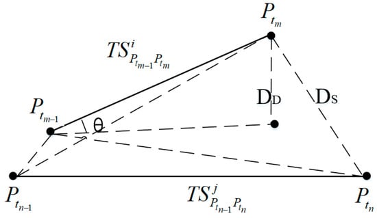 where is the direct Hausdorff distance from trajectory segment to , which identifies the point as the farthest from its nearest neighbors; is the Euclidean distance for comparing location points of trajectory segment and .