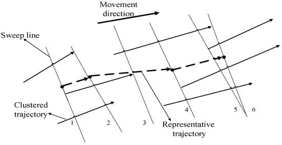 The representative trajectory also consisted of a sequence of location points. These points were determined by the sweep line approach [11]. Perpendicular to the clustered trajectory direction, the sweeping line scanned the trajectories and counted the number of intersections. If the number exceeded the threshold, we would calculate coordinates of these trajectories. Otherwise, we skipped the intersection. The average coordinates of those intersections created the new representative trajectory, and the value of their average speed was used to represent the clustered trajectories. An example of the approach was given in Figure 2 and the threshold value of intersection was set to be 3 in this example.