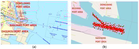 The traffic condition is complicated in Port of Tianjin, especially the central zone surrounded by three core areas of Dongjiang, Beijiang and Nanjiang around the Xingang fairway. This zone includes the original port areas and new facilities and contains mostly container and general cargo terminals. Therefore, we chose this area as our research area. Figure 3a shows the research area and red points in Figure 3b represent the locations of ships.