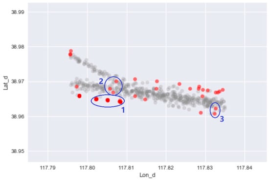 In Figure 6, we showed the abnormal data out of the clustered AIS data. The general reason for these outliers was that they located too far from the most regular points as the situation in area 1. Some location points were labeled as outliers because their speed differed widely from other points like area 2. Some points were excluded due to abnormal course over ground like outliers in area 3. The result could be used to inform coastal authorities to pay attention to these abnormal behaviors of vessels and enhance the level of maritime surveillance.