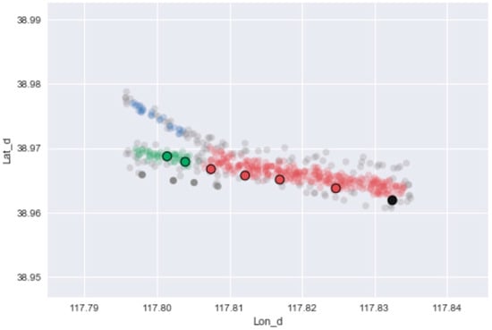 In addition, as shown in Figure 7, if we input new AIS data into the research area, the proposed algorithm could classify and label them automatically according to the previous clustering result. With this application, we could verify the rationality and distribution of planned vessel shipping route and re-plan the route based on the clustering result.