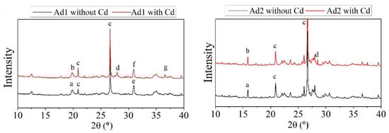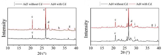 In the case of Ad3, except for Cd(OH)2 and CdCO3, a new diffraction peak 2θ = 32.6° representing KCdCl3 was observed after the loading of Cd. A new diffraction peak of around 2θ = 38.7° was observed with Cd loading, indicating the formation of complex Cd(OH)Cl, related to the complexation between Cd2+ and organic functional groups (e.g., C-O, C-OH, C-O-C) on the surface of Ad4 [35].