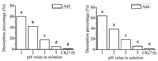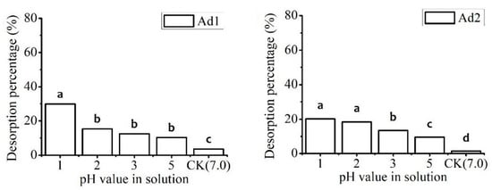 Effect of pH on desorption efficiency of Cd from Ads-Cd (ion strength was 0.1 M). Error bars represent standard deviations, and bars with different letters are significantly different at p < 0.05.