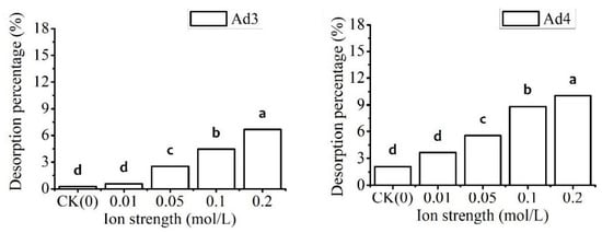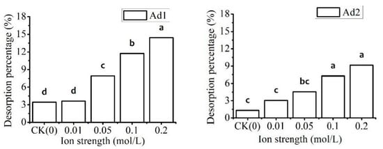 Effect of ion strength on desorption efficiency of Cd from Ads-Cd (pH was 7). Error bars represent standard deviations, and bars with different letters are significantly different at p < 0.05.