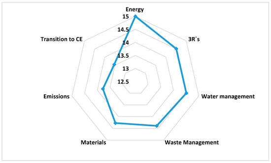 In relation to the sections that make up the scale, the analysis has determined seven dimensions: Transition to CE, Energy, 3R’s, Water management, Waste management, Materials, and Emissions. Figure 2 shows the weight of each of these dimensions in the total of the scale, highlighting as the most relevant the Energy section, which has a weight in the total of the 15% scale. Then, 3R’s and Water management with a weight of 14.5%, Waste management with a weight of 14.4%, Materials with a weight of 14.2%, and Emissions with weight of 13.8%. On the other hand, Figure 3 shows the indicators of each dimension.