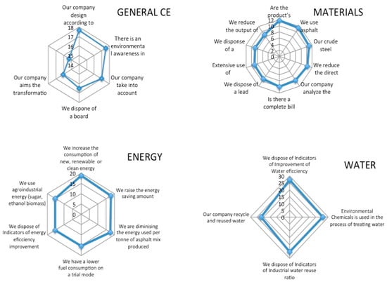 Six indicators were incorporated to the dimension Transition to CE, where the experts’ view stated the importance of design according to CE principles, as a most valued indicator of this dimension. This shows that, for the company and academics, the design in the construction sector in accordance with the principles of the CE is fundamental for the sustainability of the sector. It is also important to promote the transformation of companies towards this new productive model, taking into consideration the environmental impact of the company.