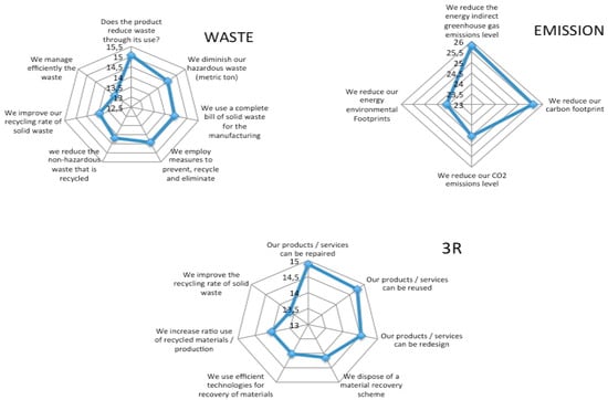 In addition, the scale Materials included ten indicators, highlighting in this group the importance of the existence of measurements on the efficiency of the use of materials, in line with Wadel et al. [55]. Besides, it is also necessary to incorporate channels into the organization that allow for the recovery of materials through a reverse supply chain. In addition to the relevance of the company using with responsibility the construction materials. The scale of measure includes two dimensions focused on the negative externalities of the companies: Emissions and Waste management. About the first, it analyses the environmental impact, being composed of four indicators. The carbon footprint and the CO2 level being the highest ranked, Thus, the idea of reducing the carbon footprint and global emissions of CO2 are the indicators that have been most valued by academics and entrepreneurs, specifically highlighting the necessity of control of the emissions footprint that was derived of the company’s energy consumption. Secondly, the waste management dimension raises the need to design products that can be reused in order to reduce the waste generated.