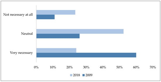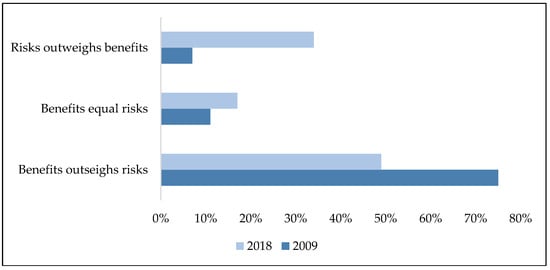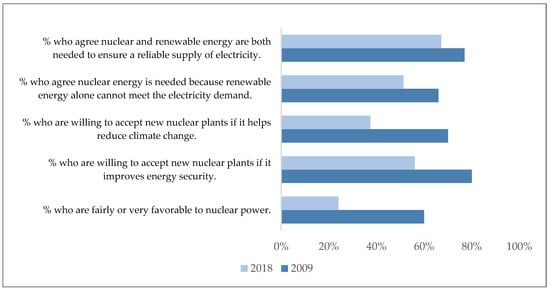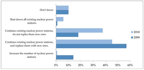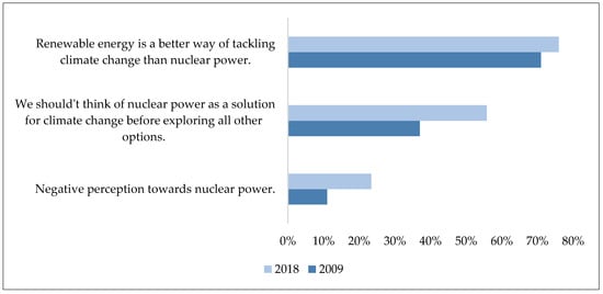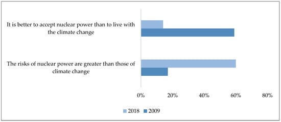 It seemed on the one hand that the public was less worried about climate change and more interested in nuclear power. On the other hand, as the results of the surveys show, the opinion that the risks of nuclear power are greater than those of climate change increased dramatically from 17% in 2009 to 60% in 2018; and, the opinion that it is better to accept the dangers of nuclear power than to risk those of climate change decreased from 59% in 2009 to 14% in 2018 (Figure 6).