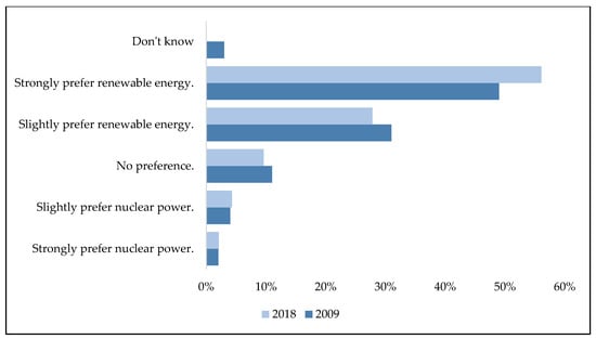 Figure 7 shows the results of the surveys on preferred energy sources, assuming that nuclear power and renewable energy meet the domestic energy demand at the same cost. 84% of the respondents in 2018 and 80% in 2009 preferred renewable energy sources. Meanwhile, fewer than 10% in both 2018 and 2009 chose nuclear energy, showing their clear preference for renewable energy sources.