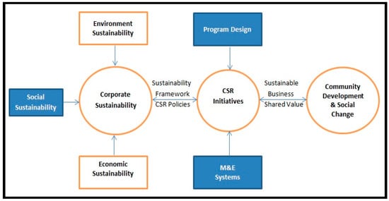 The growing importance of CSR has prompted many countries to develop statutory frameworks to regulate it. “By 2015, 98.4% of world top 64 economies have instituted a total of 366 policy instruments, among which 64.2% are mandatory” [7]. International frameworks around the social responsibility initiatives of corporates demand a greater responsibility and accountability in their operations while dealing with the communities. The United Nations (UN) Global Compact developed 10 principles (that are to be incorporated in business operations to protect human rights and the environment. UN Global Compact is a voluntary platform that presents a framework that contains 10 sustainability principles to be followed by the corporates/companies while operating their businesses. The principles have been developed around four areas: human rights, labor, environment, and anti-corruption. (Source: https://www.unglobalcompact.org/).The Global Reporting Initiative (GRI) (is another voluntary initiative that promotes sustainability reporting (that is, standard disclosures) of businesses on three major categories that are referred to as the “triple bottom line”: economic, environment, and social. GRI offers a reporting standard for preparing sustainability reports. It updates its standards from time to time. Currently, as of 25 May 2018, at 4.10 pm GMT, about 12,347 organizations from different parts of the world have uploaded a total of 29,982 GRI-compliant sustainability reports (Source: https://www.globalreporting.org). In general, these frameworks call for actions to ensure that businesses are sustainable, responsible, and accountable to the society [8,9]. These developments bring us to some essential questions about companies’ worldviews of sustainability as well as social responsibility. Since sustainability is closely linked with companies’ CSR initiatives, it is important to investigate how companies design CSR initiatives, and how effectively they implement them (see Figure 1). We propose the following research questions in this study:
